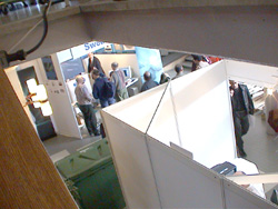 | participants remain tourists also | work goes on to have the exhibits ready for the fair | on both levels of the central space of CERN's main building |